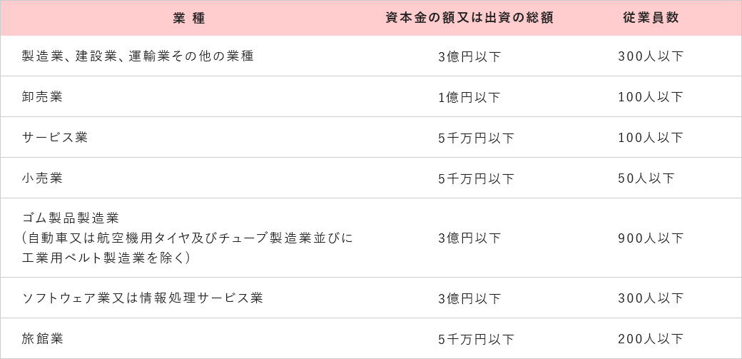 個人の事業主または会社で下表の「資本金等の額」または「従業員数」のいずれかに該当する方